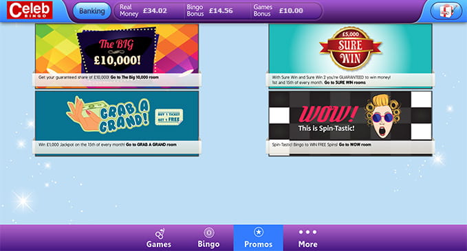 Get yourself a treat with the welcome offer from Celeb. When you register an account, you can play 3 days of free games in the ‘Quids in’ room. First-time depositors who add at least £1s, get exciting £35 free and play with amazing £45. Remember that this money can only be used for purchasing bingo tickets. Also, be advised that the welcome bonus and all other follow-up deals come with specific terms and conditions you should read before signing up. That could save you some struggles when the time for withdrawals comes.